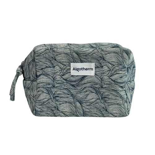 Algotherm kosmetinė – talpi ir stilinga, pagaminta iš tvirto audinio su subtiliu, jūros bangas primenančiu raštu.